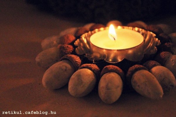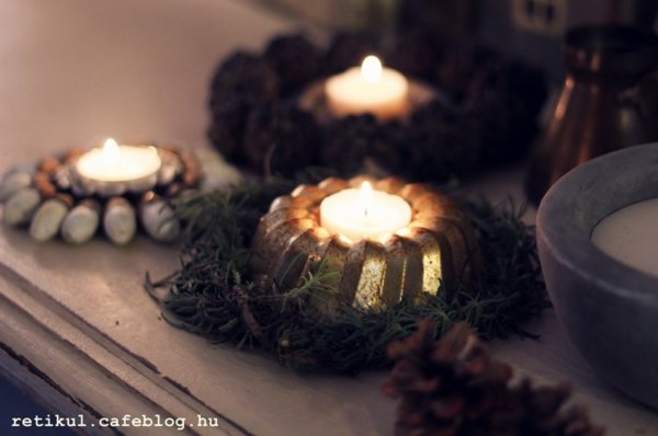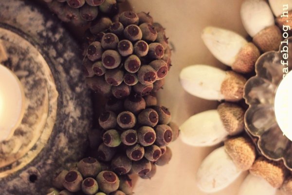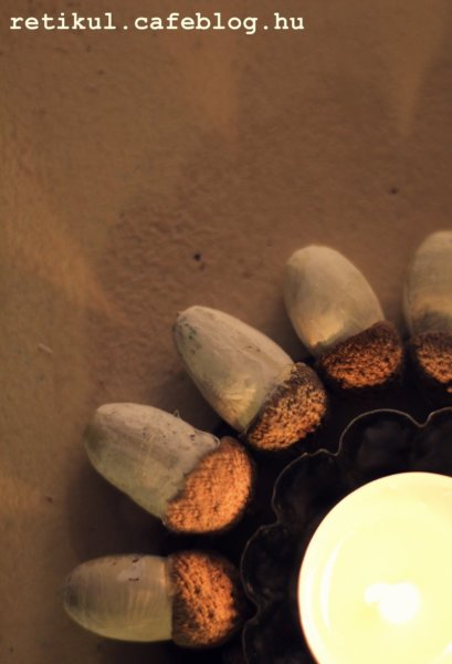 Még az ősszel gyűjtöttük,kiválogattuk,azokat,melyekbe feltehetőleg nem mászott semmi,befestettük fehérre,a kalapokat rá…egy karton körre ragasztottuk…közepébe a nagyi sütiformája,bele pedig gyertya.