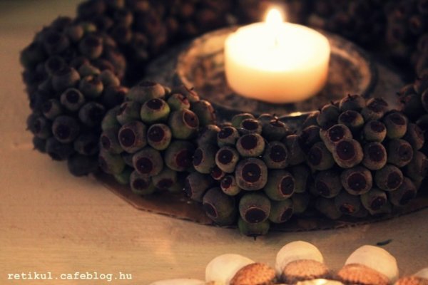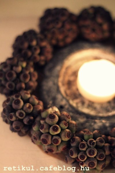 A tengerparton szedtem össze,valami kerek hajóalkatrész,amit jól megrágott a sós víz…gyertya került a közepébe.Köré borostyán termését ragasztottuk(karton alapra).