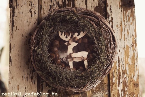 Vesszőkoszorú alap,rátekerintettem a levendula szárát,közé apró rozsdás csengettyűkoszorút tettem…Közepére pedig egy szarvast.