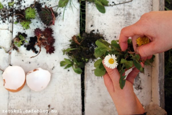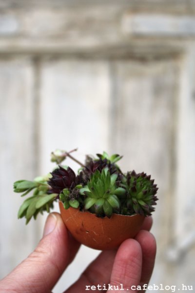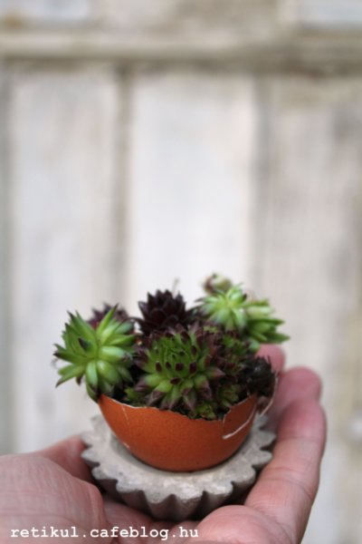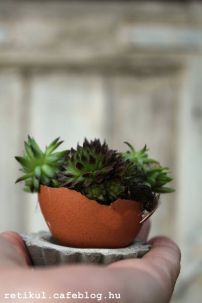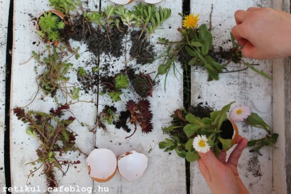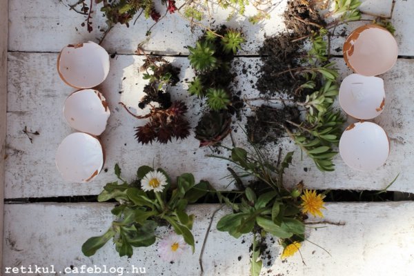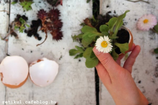 Ültethetünk a tojáshéjba pozsgásokat , amiket kiszedünk a kertből(persze a húsvét végeztével vissza ültetjük, a héj pedig mehet a komposztba), apróbb virágokat-százszorszépet,ibolyát vagy épp, amit találtok a kertben, fűmagot, különféle magokat csíráztathatunk is benne.