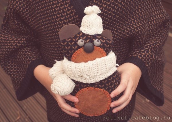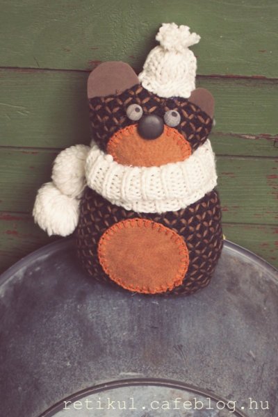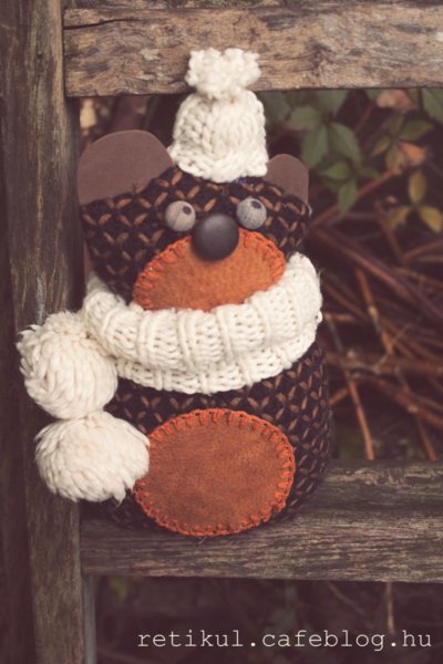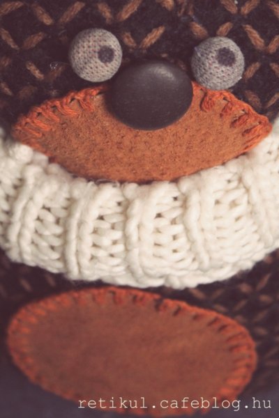 Maradék anyagokból került rá a pofija és a pocakja,a sálja és a sapija is,a gombok-szemek,orr- pedig a nagymamám gombos dobozából valók.